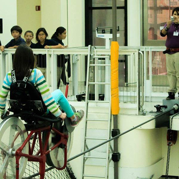 For a fee, a visitor can ride the center's "High Wire Bicycle." Participants ride along a three-inch wire, as they experience the law of "center of gravity" while suspended 43 feet above the ground. A counterweight attached to the bicycle helps to offset any tipping to the right or left.