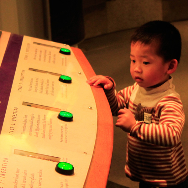One of the goals of the center is to attract younger visitors. This little boy is curious over the what the green buttons will do with the digestive system exhibit.
